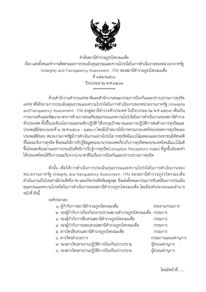 ประชุม ขับเคลื่อนและกํากับติดตามการประเมิน ITA ประจําปีงบประมาณ 2567 ของสถานีตํารวจภูธรโพรงมะเดื่อ